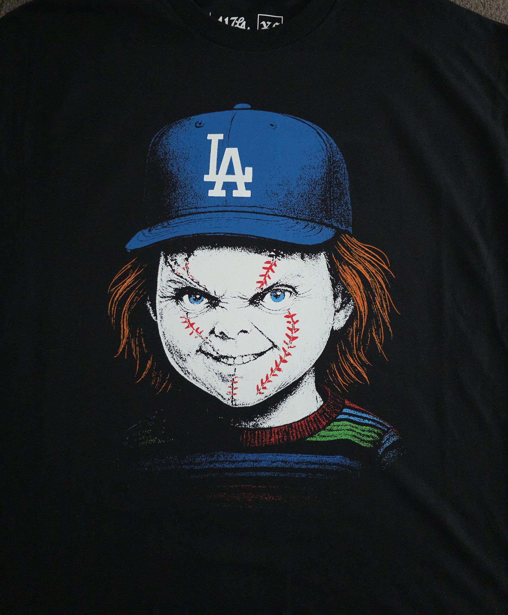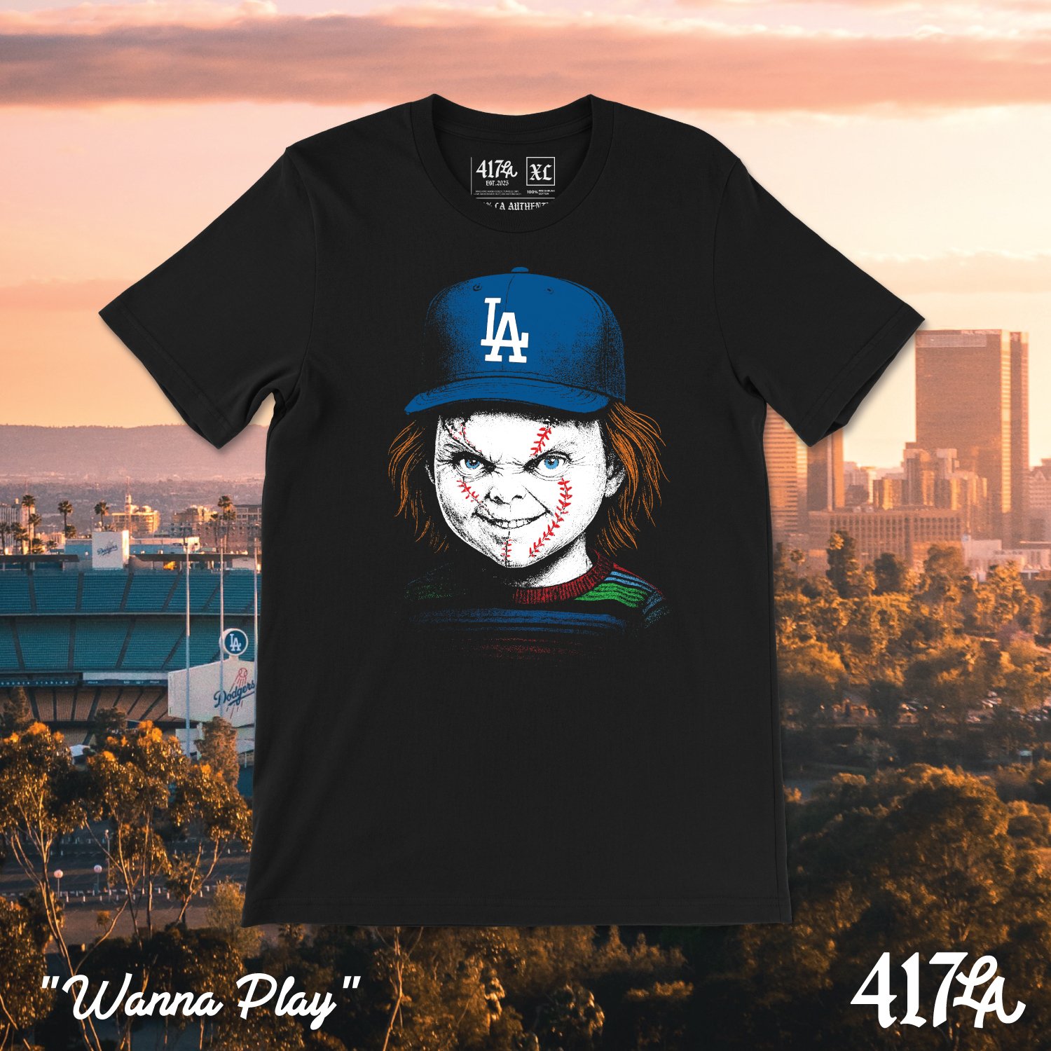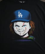 Bring the ultimate mash-up of horror and baseball to your collection. This exclusive 417LA design features a sinister Chucky with baseball-stitched scars, rocking the iconic LA cap. Perfect for Dodger fans who love a little edge in their style.